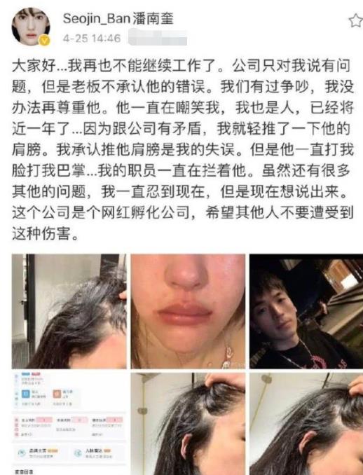 2020年4月25日,潘南奎发布了一则微博,大概意思是老板与她的想法相悖,自己被嘲笑得忍无可忍,就轻轻推了一下他。