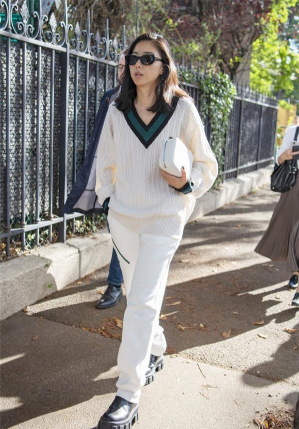 白色休闲酷搭配一双纯黑色厚底皮鞋,这样两种单品结合的造型严谨又低调质朴,上半身是一件米白色V领针织毛衣,散发柔和温情之美。黑色与墨绿色线条融合,突出精致V字领,而且突出唯美高雅风韵,手提包纯白色更能突出温和端庄格调
