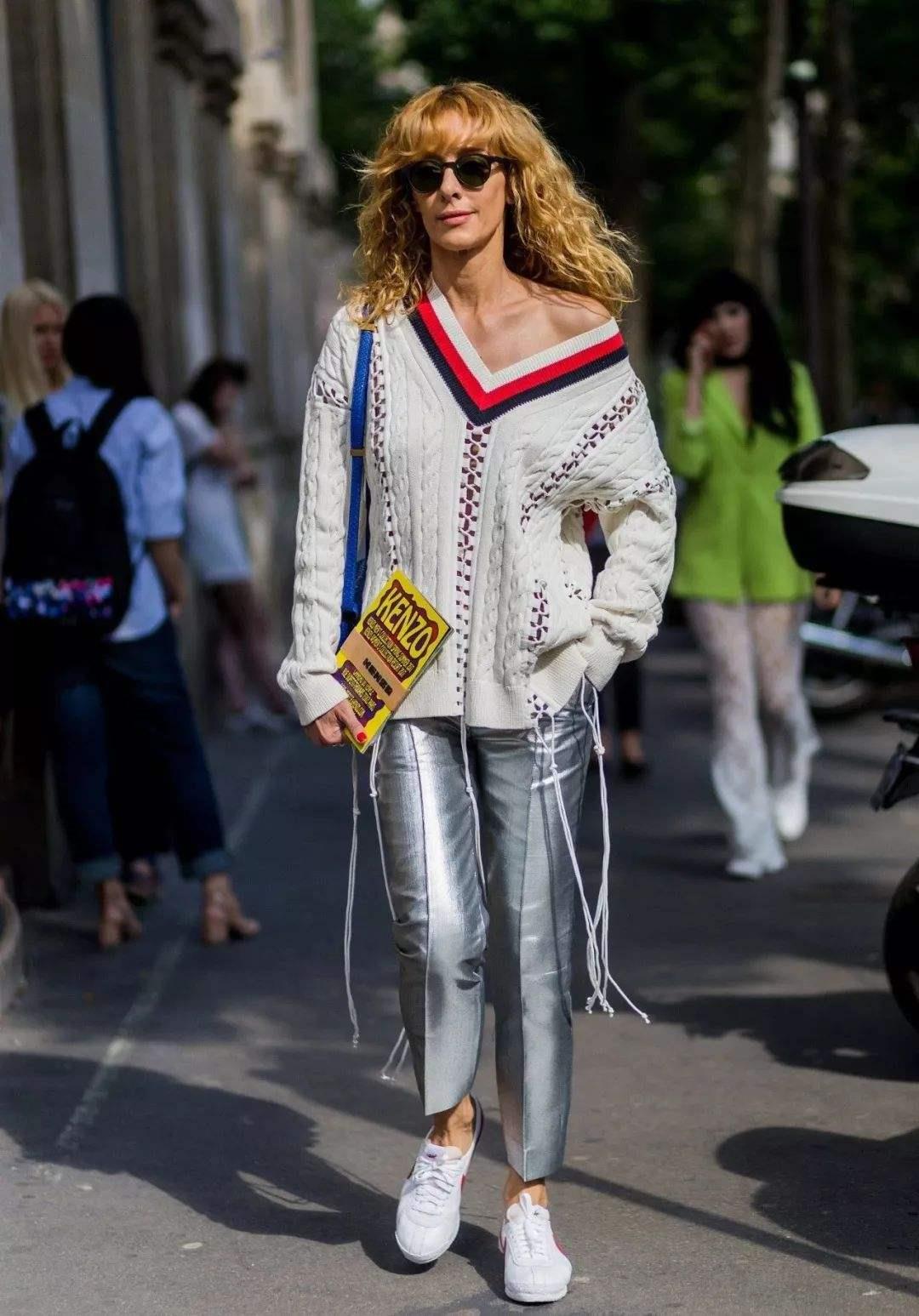 这款毛衣采用的是半一字肩设计风格,斜侧的V领塑造高端创意美,利用黑红白三色拼接,打造鲜明层次风韵。毛衣上的流苏线条相当吸睛,增添不少拽酷个性风格,亮银色皮裤突出雍容之美,脚踩帆布鞋相当惬意清新,蓝色单肩背包更突出迷人优雅风韵