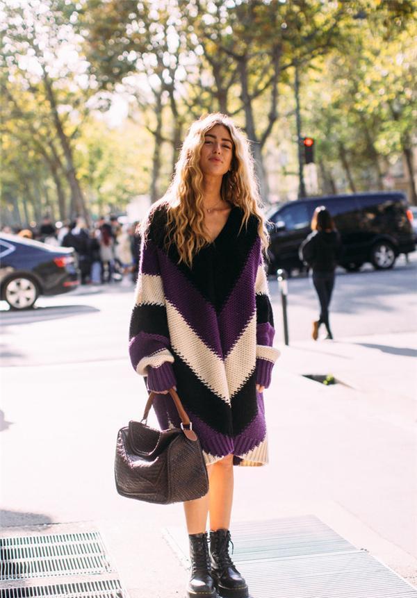 这是一条V字领针织连衣裙,将毛衣的柔和浪漫风韵与裙装的性感飘逸气息融合,这种feel纯美自然。整条裙身是黑紫白三种色调结合,层叠的V字型更起到拉长身姿的作用,脚踩黑色马丁靴,小腿细长让人挪不开视线,欧式卷发造型更散发十足撩人浪漫chic