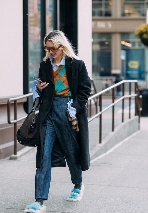 这件V领毛衣采用的是青色又橙色交错拼接设计,加以黑色线条进行修饰,菱形图案增加个性风韵,而且高级耐品。内搭一款蓝色条纹衬衫,瞬间多了不少清新风韵。外搭一款黑色大衣非常优雅,下半身牛仔裤格调休闲稳重。脚上蓝白色毛绒平底鞋特别吸睛,淡色系渲染出的文艺纯真美感你爱吗?