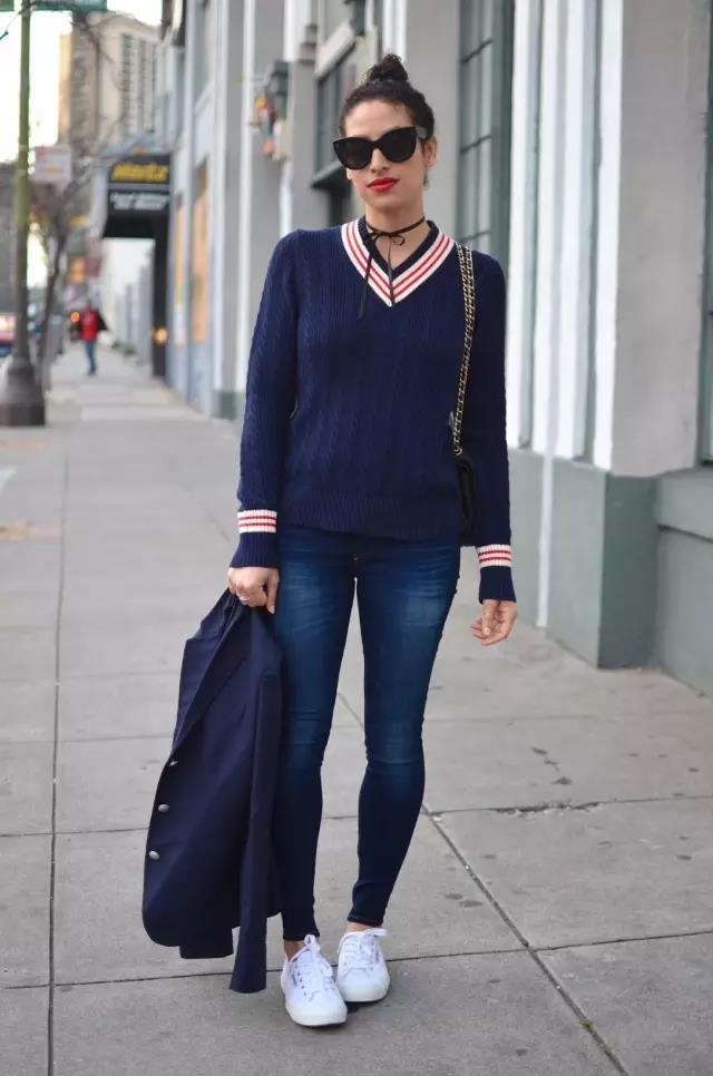 深蓝色V领毛衣款式比较常规,突出的白红线条突出V字型,增加不少俏丽可爱气息。纯黑色线条做锁骨链非常精致,系成蝴蝶结形状又增添柔和少女风韵。丸子头发型显得身姿更为高挑,牛仔裤小白鞋结合率真休闲,日常出街这样搭,舒适更轻巧