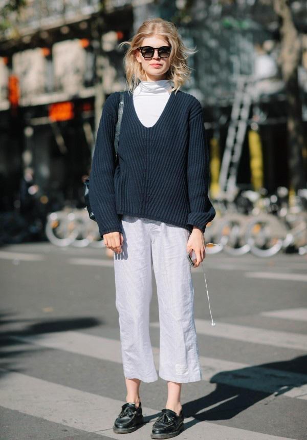 一条米白色亚麻质地休闲裤惬意舒适,搭配小白鞋,轻巧率真而且散发温和学院风清纯之美。上半身是一件黑色V领针织毛衣,隐晦的对称斜条纹款式增加柔和协调美。高领白色打底衫针织毛衣叠穿,巧妙洋气,大家一定要get当下非常时髦的叠穿搭配术哦