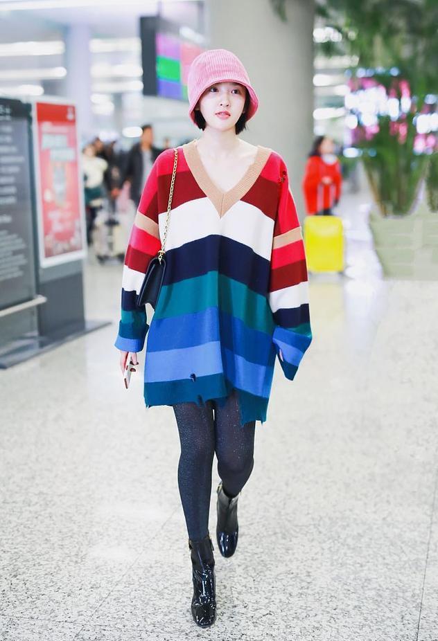 唐艺昕身穿的是一件特别减龄的七彩条纹V领毛衣,嫩白天鹅颈线条性感撩人,头戴一顶纯粉色小毡帽,营造浓厚的少女风韵。镶嵌有亮丝元素的打底裤营造迷情性感之韵,脚上是一双黑色漆皮马丁靴,亮眼高级。搭配一款藏青色链条背包,休闲而且优雅靓丽