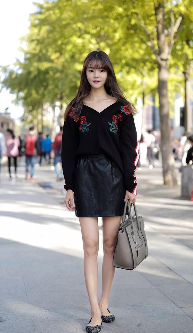 这件V领印花黑色毛衣,采用黑丝绒设计款,质感相当纯美高级。艳丽的红绿色花朵图案形成对称感,突出活力风采,而且有充满雅致风韵。黑色平底皮鞋搭配小黑裙,这二者的结合又营造出相当悠扬的迷情格调,淡灰色手提包增添稳重感,韩式空气刘海披肩发更散发着端庄迷人之美