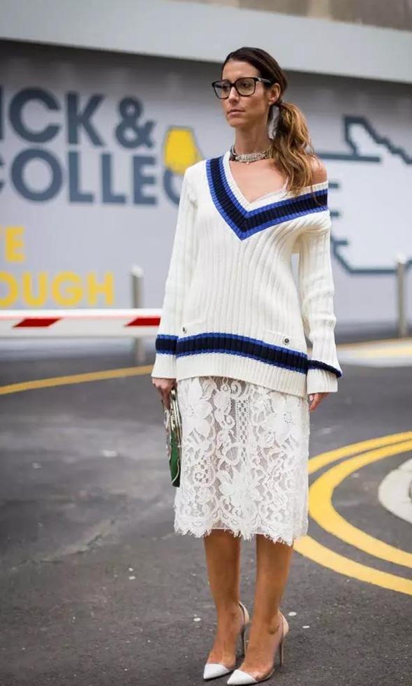 这种斜一字肩V领毛衣款式也是近年来非常出众的一种新鲜时尚,这件毛衣以米白色为主色系,突出温和恬静feel,蓝黑色线条做点缀色,给柔美毛衣增添几分稳重高雅风韵。白色蕾丝纱半身裙突出十足浪漫意蕴,隐约透视感又将性感魅力突显,军绿色手拿包知性风情特别浓厚