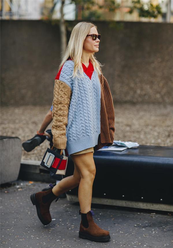 这件V领运用大红色针织元素突出,抢镜而且增添不少创意风趣。主色调为浅蓝色的这件毛衣很是温存简约,两侧双袖是不同的棕色裁剪元素,出众个性的搭配法耐人品味。下半身凹上一条简约针织裙,搭配焦糖色马丁靴,腿部肌肉线条格外突出,这款混搭格调穿搭不仅拘泥于欧美style中,我们也可以学习穿起来,展现创意率真自信美