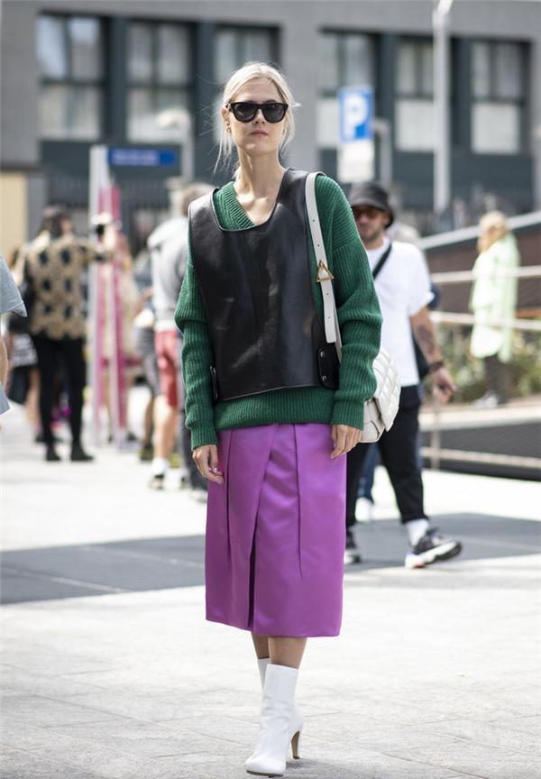 这件深紫色半身裙知性雅致风韵突出,上半身V领毛衣是深绿色的款式,大气稳重,突出内敛质朴风范。外搭一件黑色皮革方形无袖马甲,相当有创意而且个性。搭配白色背包非常温和,同时与白色马丁靴相呼应。中分低马尾造型很精致,些许碎发更散发着柔美灵动气息