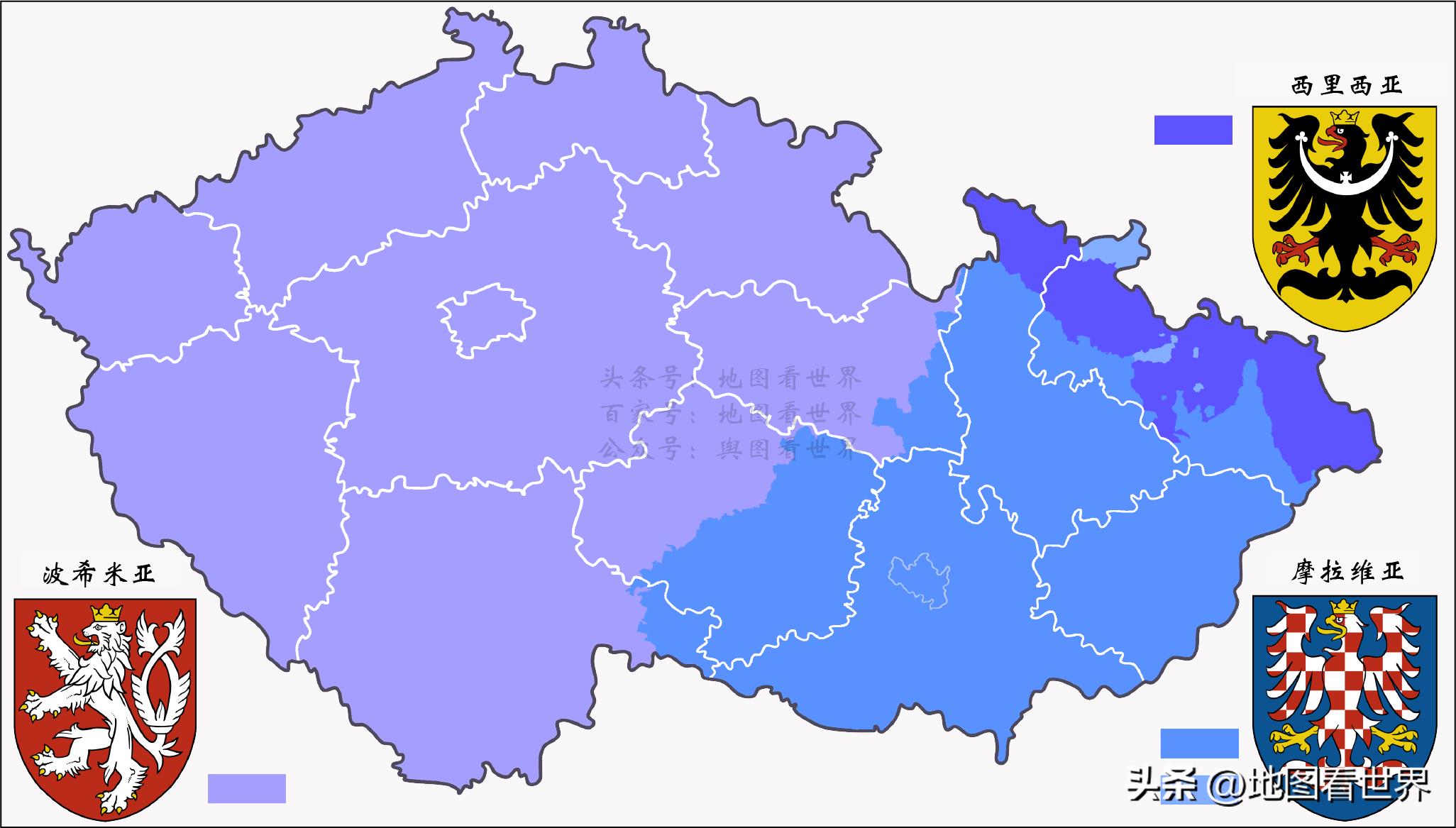 捷克人从历史发展的角度分为三个分支:波希米亚分支占人口总数的89%,摩拉维亚分支占人口总数的3.3%, 西里西亚分支占人口总数的0.1%。各分支生活的地区就演变为捷克的三个传统地区——波希米亚、摩拉维亚和西里西亚。波西米亚面积5.2万平方公里,占捷克总面积的66.0%;摩拉维亚面积2.2万平方公里,占捷克总面积的28.3%;西里西亚面积4459平方公里,占捷克总面积的5.7%。捷克国徽也形象地揭示了其历史的渊源:左上和右下的双尾狮代表波希米亚,右上格子花纹的鹰代表摩拉维亚,左下的黑鹰代表西里西亚。