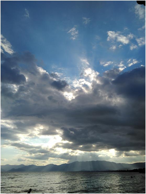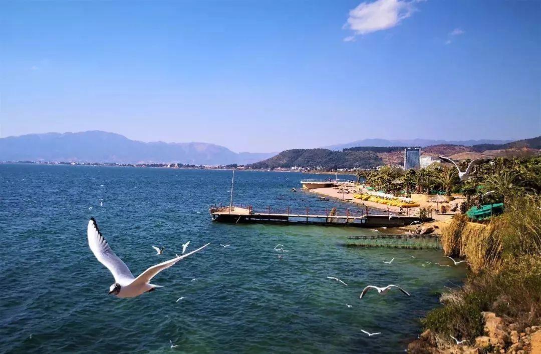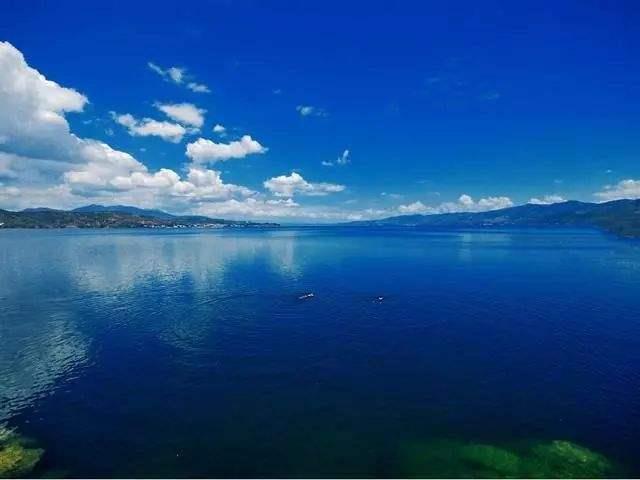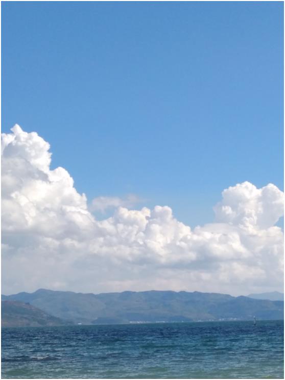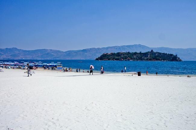 一片金黄的沙滩尽头连接着蔚蓝色的湖水,走在发烫的沙滩上,眼睛紧盯前方的湖水,晶莹剔透的湖水带来视觉上的清爽。立于水边,目光不再舍得移开,清澈的湖水犹如“琉璃万顷”,一湖碧水,波光粼粼,绮丽美妙,“百里湖光小洞庭,天然图画胜西湖”,已感叹于洞庭湖的美和西湖的娇,抚仙湖给人惊艳的感觉。惊叹湖泊的大、湖水的深、颜色的蓝、这种美艳而不俗、艳丽耀眼、争奇斗艳,“万顷平湖一鉴清,谁教皓魄涌波明。” “凭虚不用乘槎想,时泛仙舟到海灜。” 湖水让人宛如到了仙界瀛洲,面对湖水,人们停止了交谈,瞬间被这种美所折服,蓝的让人沉醉、蓝的让人发呆、蓝的让人忘记繁杂、蓝的让人不再思考。远处的高山成黛青色,亦沉默不语,可是降落人间流连忘返的仙人,欣赏上千年仍没看够。这又是一处为上天垂青之所。