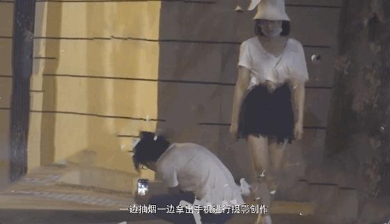 不久后,两人又来到某处拍照,男子为了拍好路边街景,一屁股蹲在地上,黄龄则在一旁宠溺地望着他。