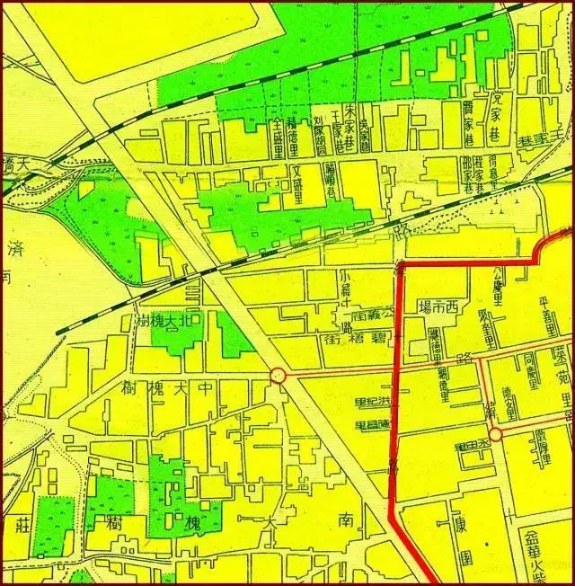 比如说,十二马路一带历史上,随着人口兴旺繁衍生息,居住地形成村庄,又在秦琼植槐传说中,大槐树庄村名越来越响亮。久而久之,集聚人口越来越多,逐渐又分离岀北、中、南大槐树庒来,相当多流离失所的人们聚集谋生,从小商小贩、蔽雨掤户开始,种田的种田,摊贩的摊贩,慢慢形成有秩序的住所、道路,由庒变为“街”,由胡同变为“里”,形成了相当规模的北、中、南三个片区的街和若干个里弄。按照现今部局分别规划为:西市场(北大)、中大(裕园)和道德(南大)三个大槐树街道办事处管辖了。