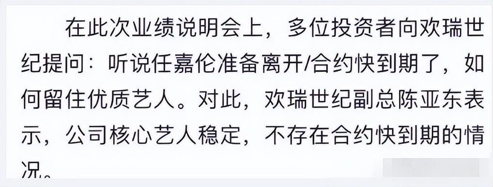 搜狐娱乐讯 近日,欢瑞业绩说明会上,有投资者向欢瑞世纪提问:“听说任嘉伦准备离开/合约快到期了,如何留住优质艺人。”对此,欢瑞世纪副总表示,公司核心艺人稳定,不存在合约快到期的情况。