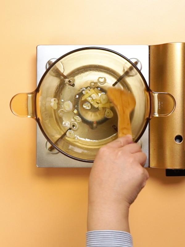 2. 锅中放油,倒入姜片,葱花,大火爆香
