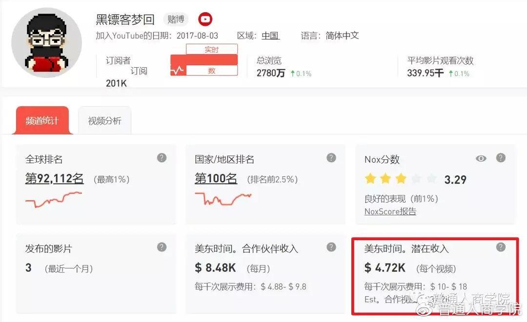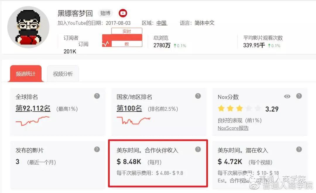 YouTube收益:统计网站给出的预估收入为8480美元/月,约合人民币6.01万元/月。