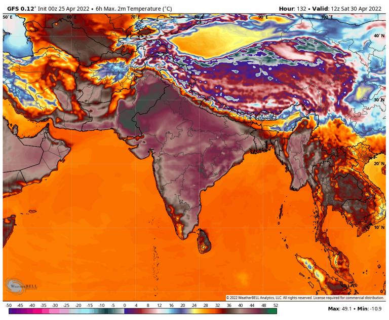 本周一,印度多个城市的最高气温超过42度,中西部马哈拉施特拉邦的瓦尔达市更是达到了45度。而更大的一股热浪预计在本周后半段来袭,印度北部和西部的部分地区,特别是靠近巴基斯坦和尼泊尔边境的地区,可能会出现极端高温,到周五至周日时,温度会达到50度。这种温度对人类来说是个挑战值。