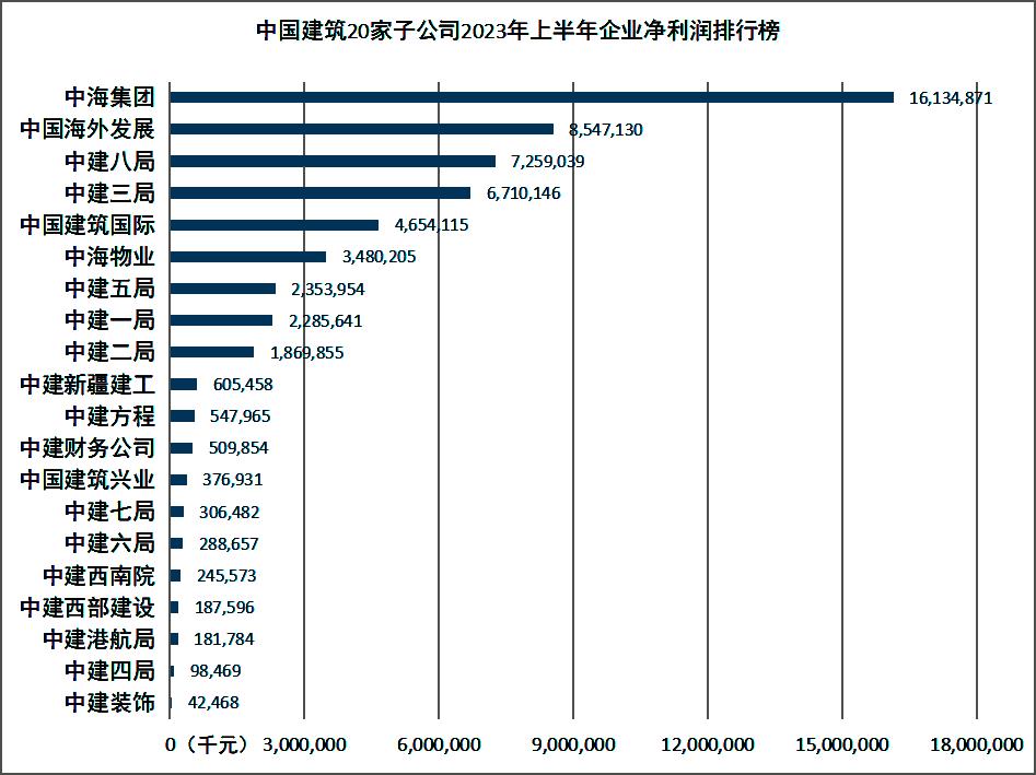 近日,中国建筑正式发布其 2023 年企业半年报,官方披露了 20 家子公司 2023 年上半年企业净利润: