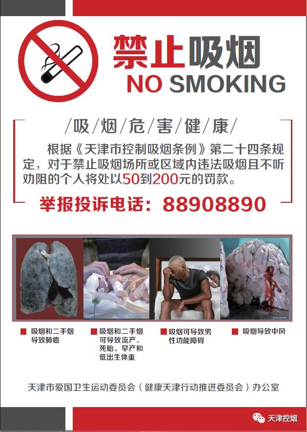 在第33个世界无烟日来临之际,为进一步推动《健康天津行动实施方案(2019-2030年)》控烟目标的实现,强化禁烟标识警示效果,减少公共场所违法吸烟行为,倡导文明健康生活方式,在原有禁烟标识的基础上,天津市爱卫办设计制作了3款升级版禁烟标识,增加了图文信息,更加具有劝阻和警示作用。
