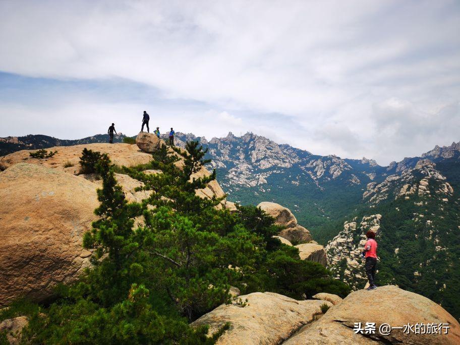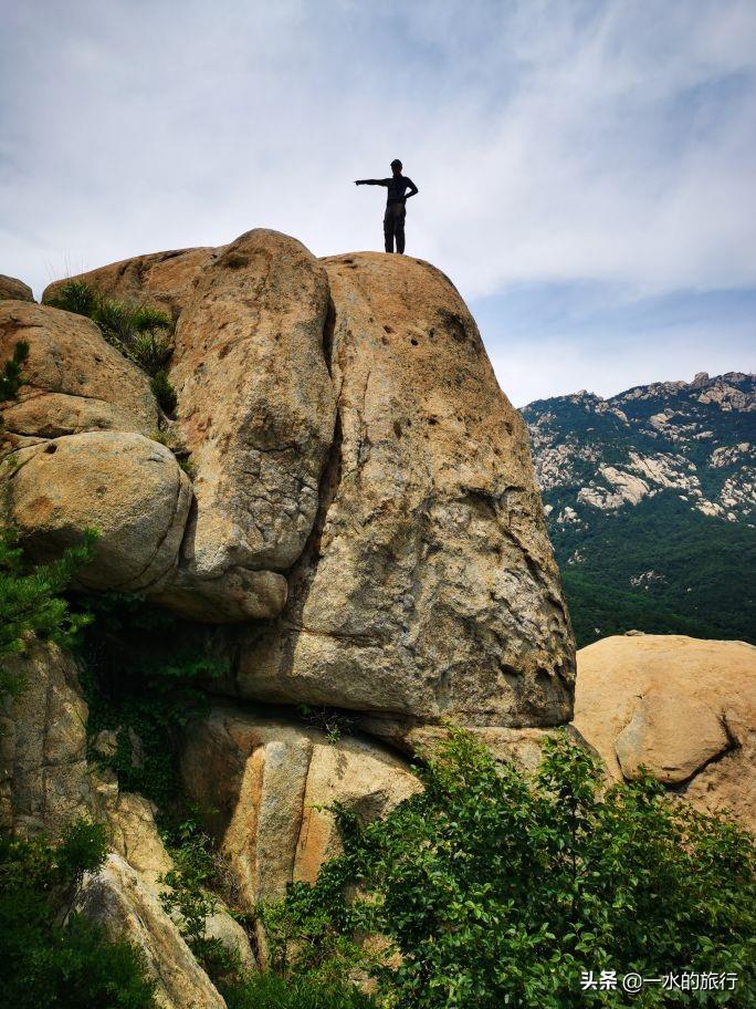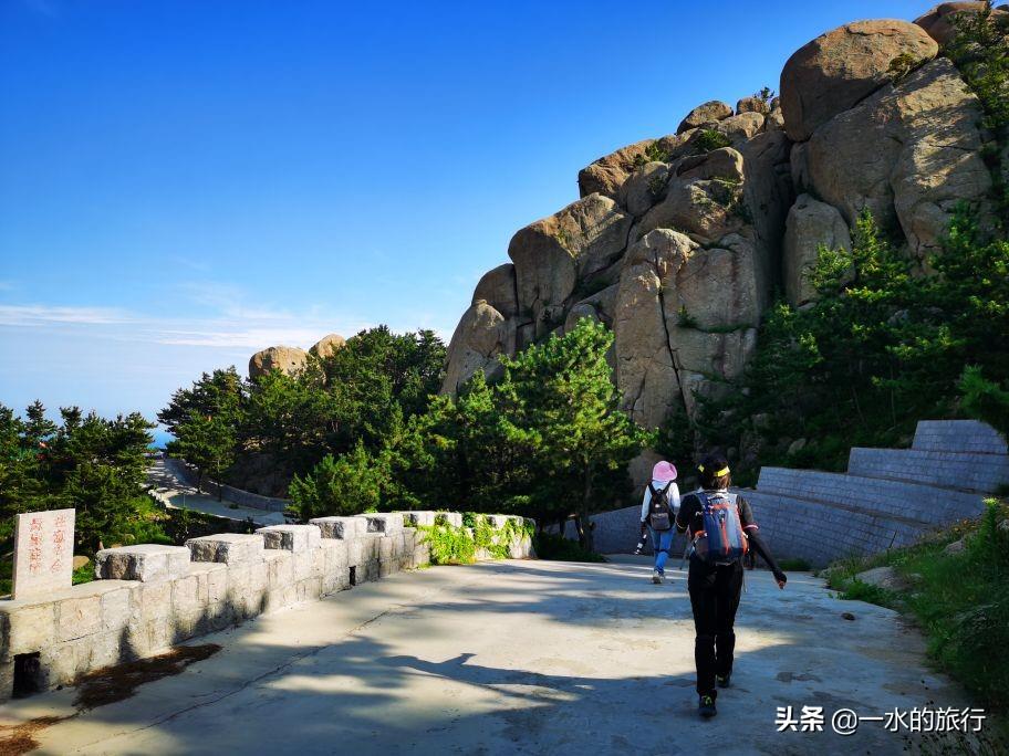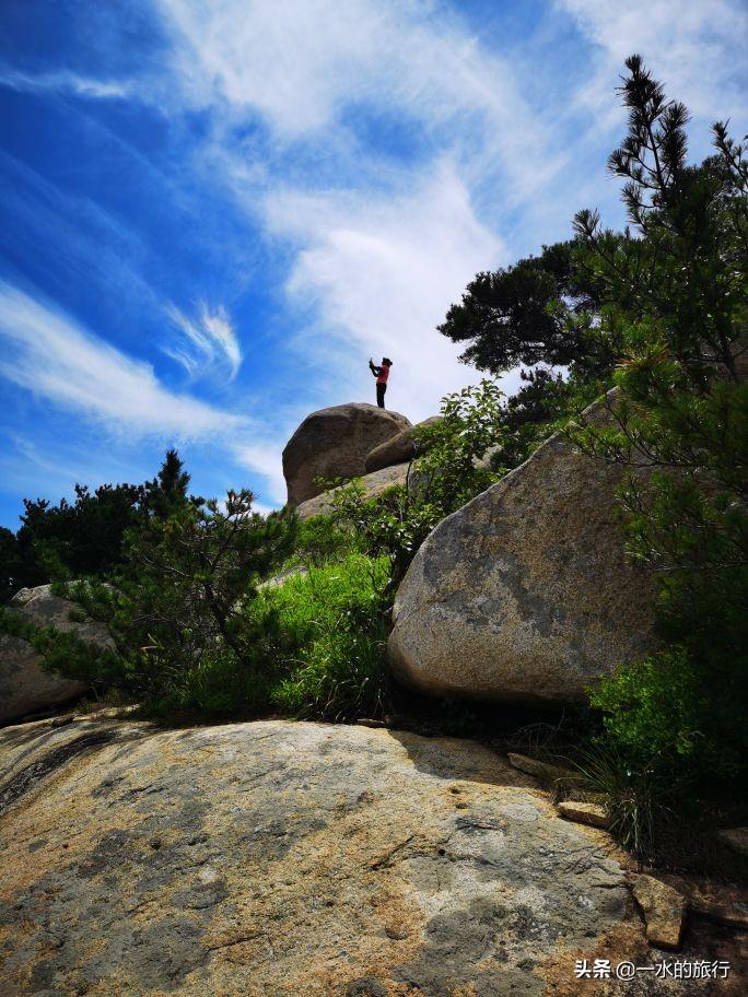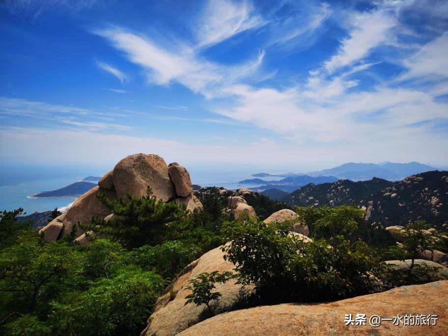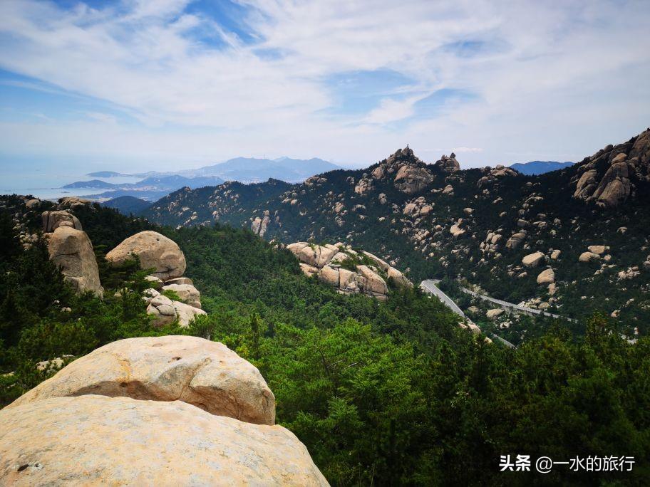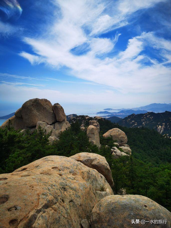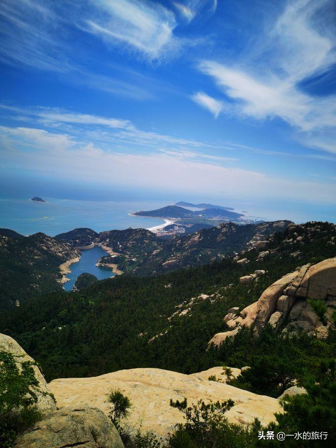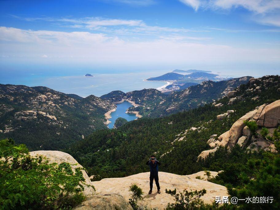 站在山顶,凉风习习,周边山花岗岩石裸露,群峰竞秀,北望崂顶巍巍,南望碧海万顷,山海相连,白云飘飘,令人心旷神怡。山腰间公路盘旋如彩带,流清河景区内大巴穿梭,索道站上下运送着游客。秀美的风景把登山的疲惫一扫而光, 大家尽情地拍照打卡。