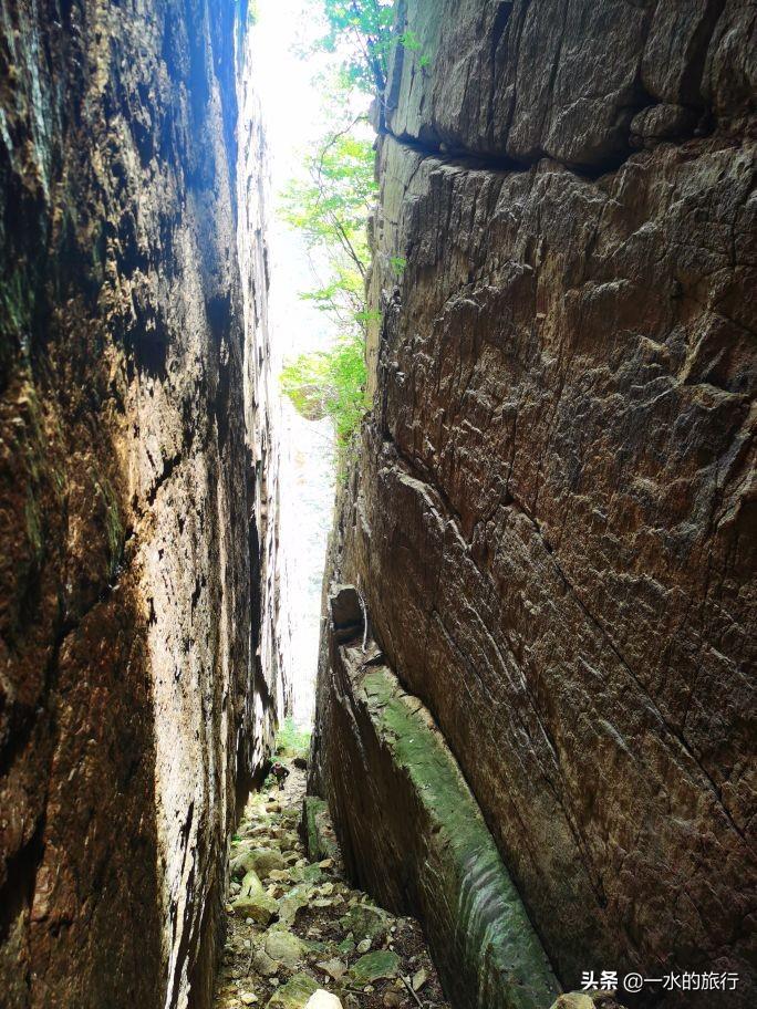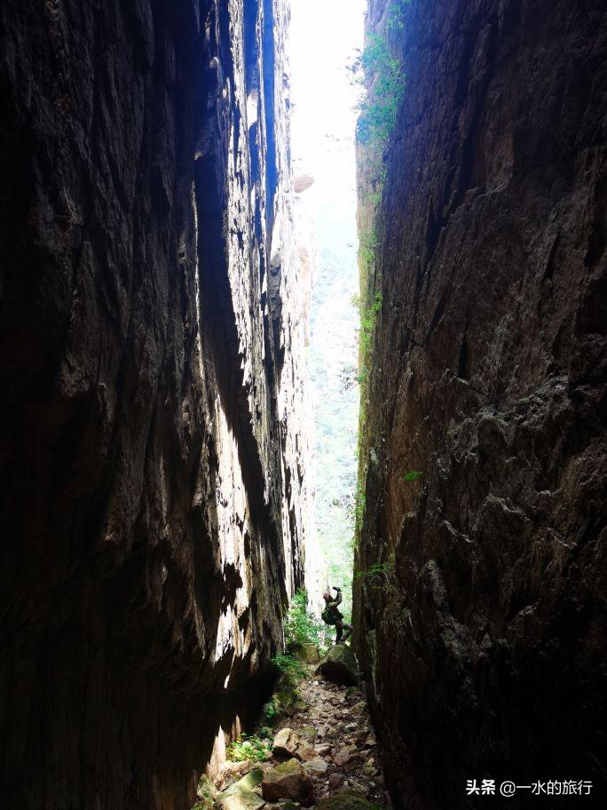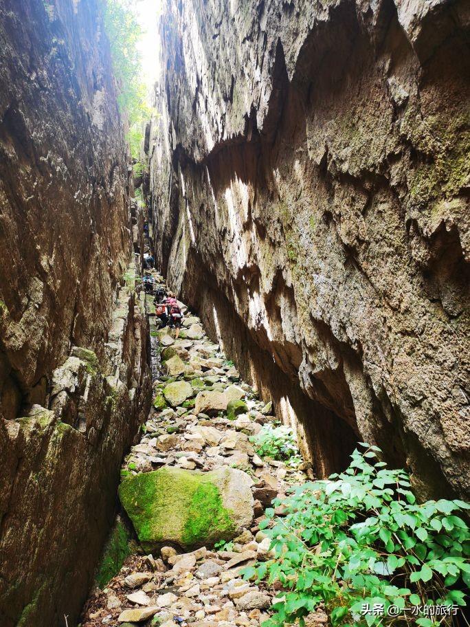 沿途休息了几次,终于到达天河大峡谷。峡谷两侧悬崖垂直壁立,一线中天,高约百米。峡谷内宽度仅2-3米,乱石杂沓,有巨石掉落卡在峡谷中间,看似惊险万分。