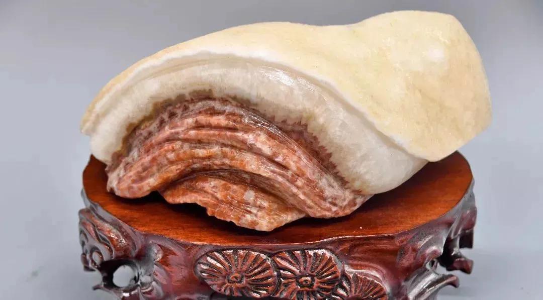 生活中常见的红白相间的肉石较多,有皮有痩有肥的比较罕见。收藏者多把“猪肉石”看做吉祥、喜庆的象征。