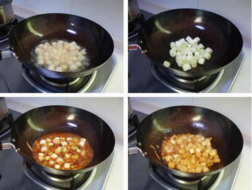 3、锅中多放些油,待油烧至七成热时,将贝肉均匀的滚上一层干淀粉,放入锅中炸一分钟,捞出沥干油。