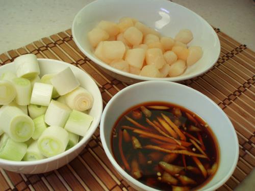 鲜贝、大葱、鱼香汁、青红辣椒各一个。