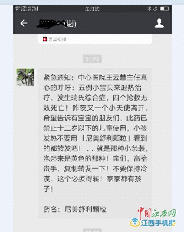 中国江西网讯 记者李志强报道:近日,多地网友在朋友圈出现一则“五位小朋友服用尼美舒利颗粒退热死亡”的消息。一时间朋友圈内流言四起,引发很多家长担心,大家把这条消息当作善意的提醒大量转发分享。那么,这条消息是真的吗?对此,中国江西网记者进行了调查。
