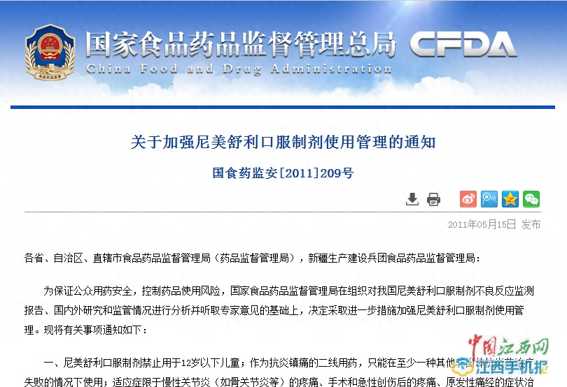 中国江西网记者注意到,国家食品药品监督管理总局网站于2011年5月15日发布了“关于加强尼美舒利口服制剂使用管理的通知(国食药监安[2011]209号)”,内容大致提到:服用尼美舒利口服制剂可能出现不良反应,将采取措施加强使用管理,禁止用于12岁以下儿童,作为抗炎镇痛的二线用药,只能在至少一种其他非甾体抗炎药治疗失败的情况下使用。