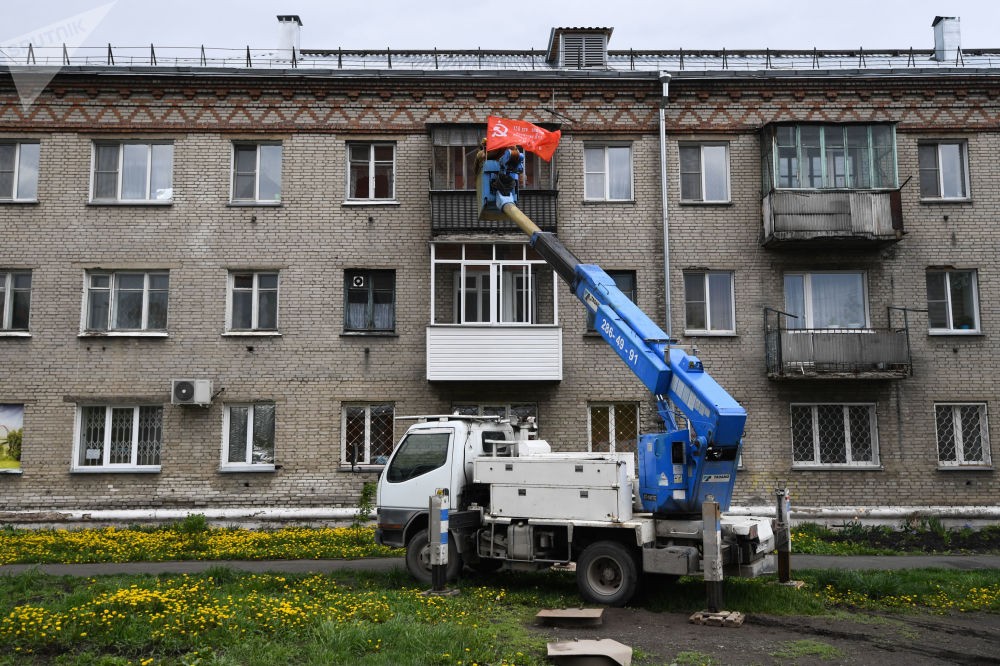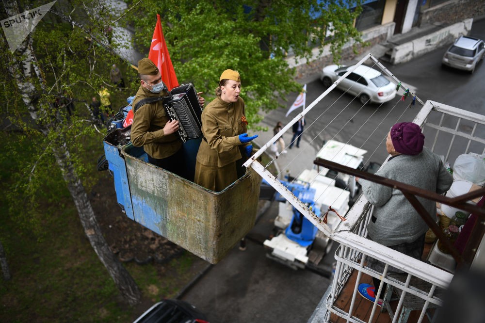 5月9日胜利日时,俄罗斯一些小区用起重机把演员送到老兵的窗外,进行演奏。今日俄罗斯图