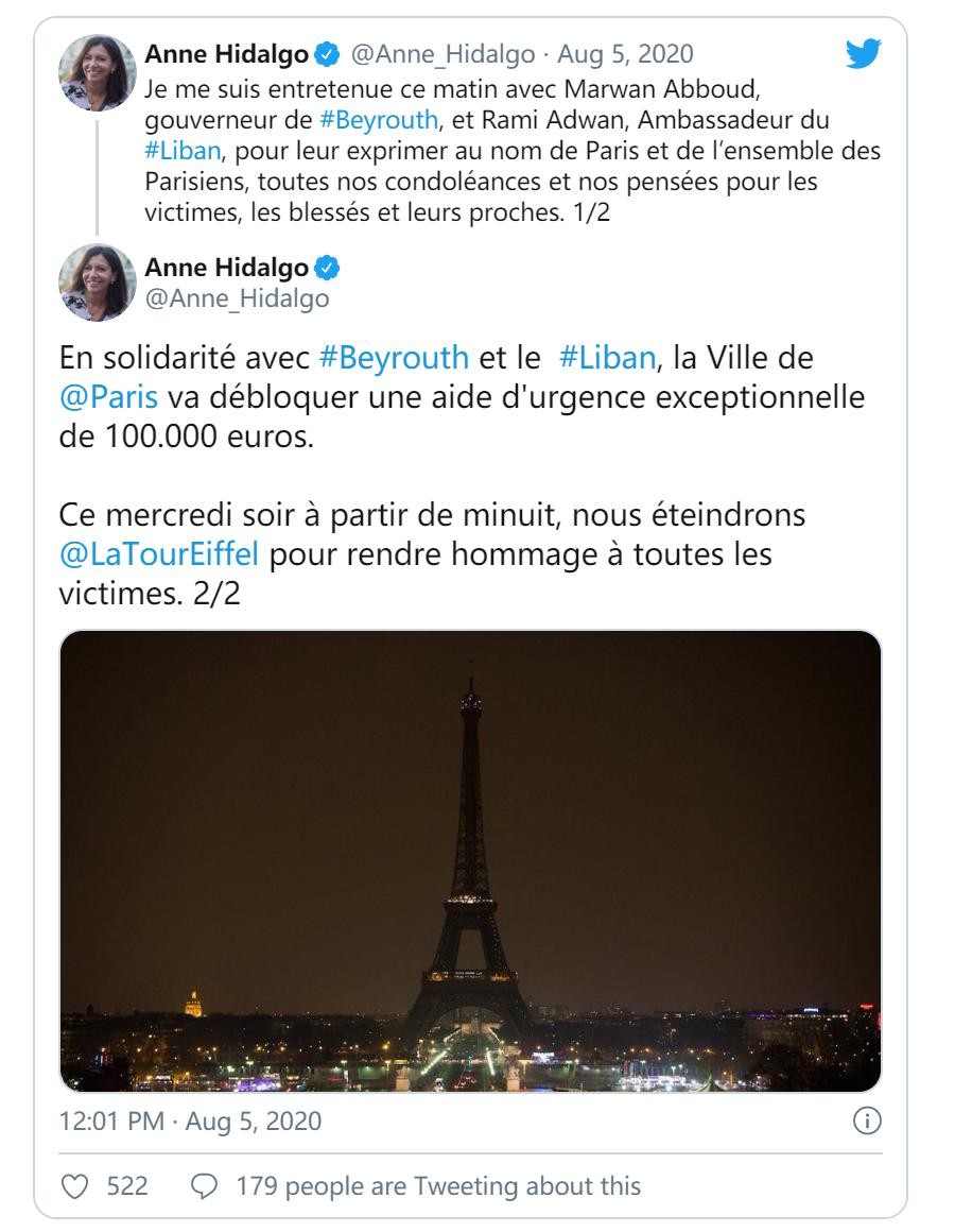 巴黎市长宣布将提供10万欧元救援,5日凌晨起,埃菲尔铁塔将灭灯以向遇难者致哀。(图片来源:推特截图)