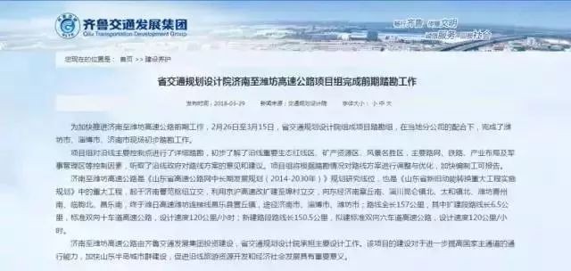 从山东省交通规划设计院获悉,该院完成了济南至潍坊高速公路项目组的前期踏勘工作。济潍高速与济青高速北线大体平行,也被看做“济青中线”的西段,此前一直流传于坊间的传言,现在终于实锤落地。