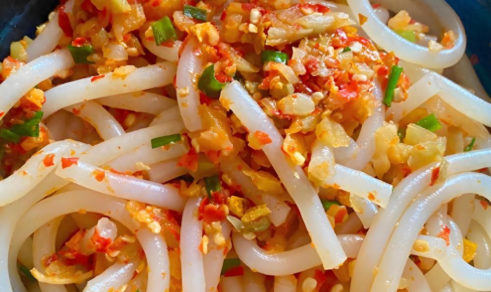 冷粉是景德镇的传统特色小吃。它选用优质的米粉,经过独特的工艺制作而成。冷粉的特别之处在于它的口感,米粉粗而有嚼劲,入口爽滑。冷粉的调料是其灵魂所在,一般会加入辣椒、葱花、榨菜、萝卜干等。辣椒的香辣、葱花的清香、榨菜和萝卜干的咸香与米粉完美融合,吃起来香辣可口,是景德镇人早餐或者小吃的常见选择。