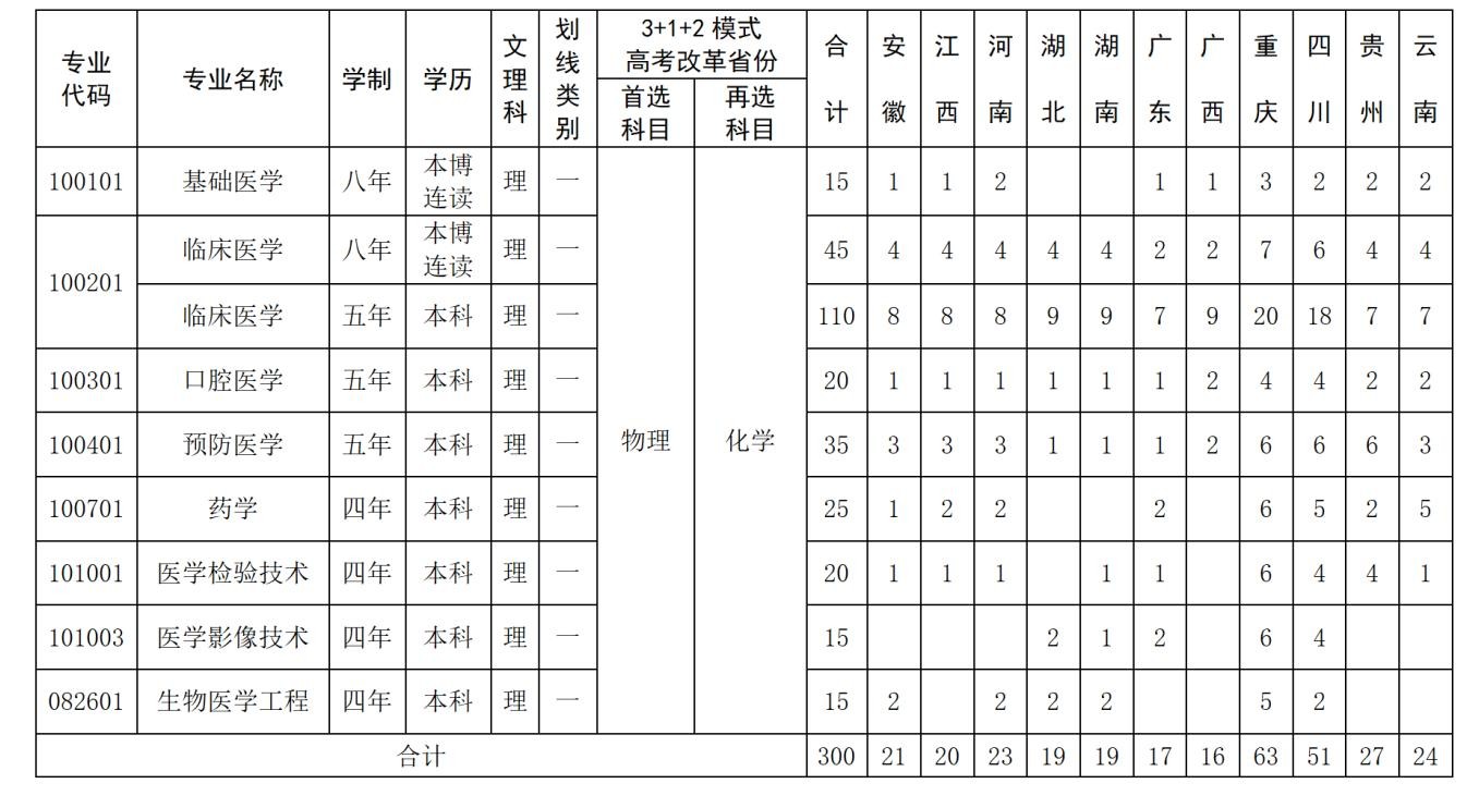 招生专业:基础医学、临床医学八年制、临床医学五年制、口腔医学五年制、预防医学、药学、医学检验技术、医学影像计划、生物医学工程