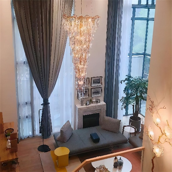 室内的大客厅层高足有8米多,两米多的水晶吊灯像一颗硕大的钻石一样悬挂在客厅中间。挑高的客厅大气又奢华。