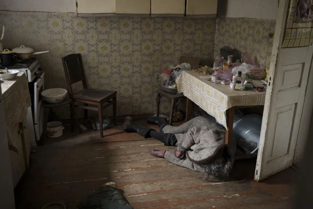 ▲2022 年 4 月 5 日,基辅郊区布查,一名老妇人的尸体静静地躺在厨房的餐桌下。