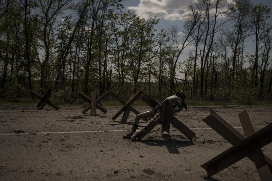 ▲2022 年 4 月 30 日,乌克兰哈尔科夫郊区,一名身份不明男子的尸体躺在一个路障上。