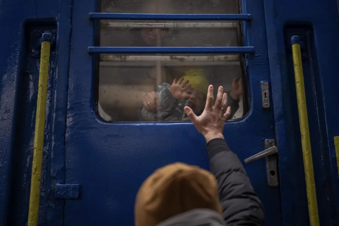 ▲2022 年 3 月 3 日,乌克兰基辅,孩子们从开往利沃夫的火车上向窗外眺望。