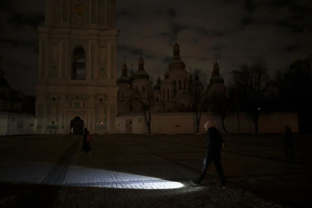 ▲2022 年 12 月 14 日,乌克兰基辅停电期间,一名妇女拿着手电筒走路。