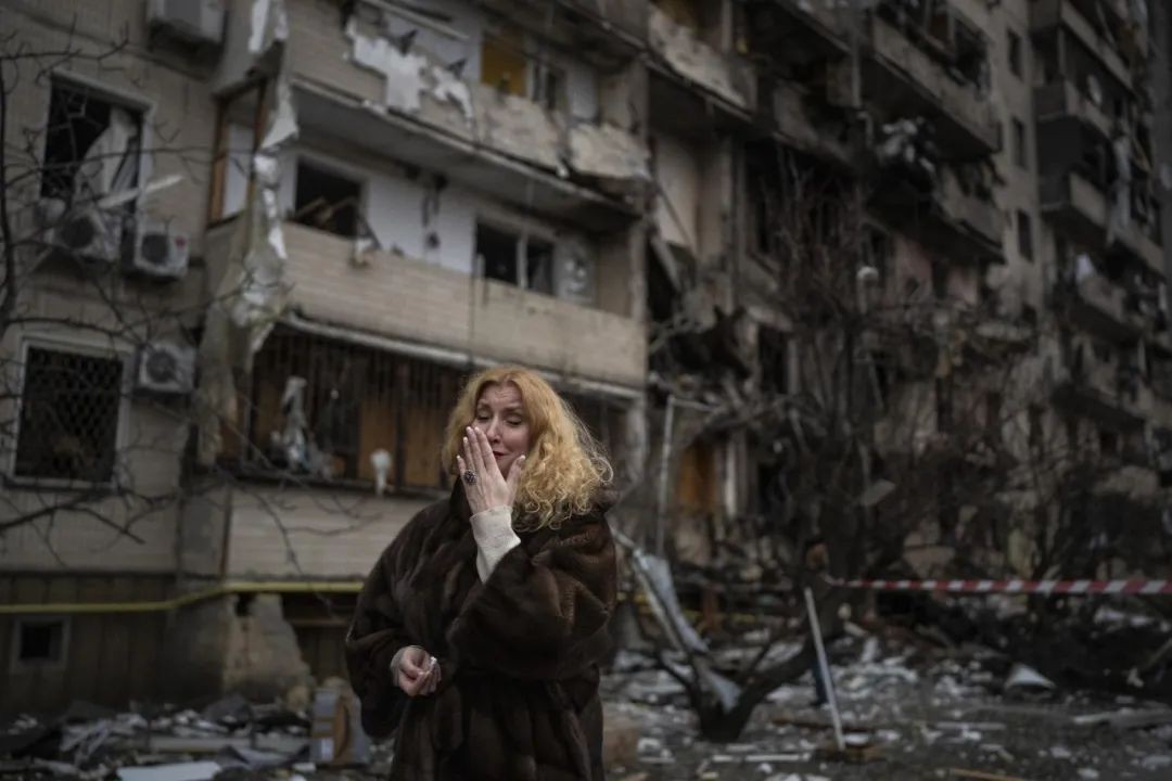 ▲2022 年 2 月 25 日,在乌克兰基辅发生火箭弹袭击后,纳塔利·谢夫留科娃站在被毁坏的公寓楼外,失声痛哭。