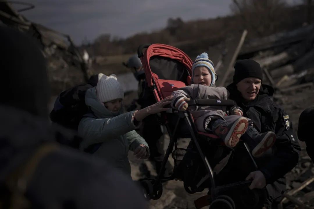 ▲2022 年 3 月 9 日,当人们逃离基辅郊区的伊尔平时,一辆婴儿车被抬过一条临时搭建的小路,婴儿车里的孩子还在哭泣。