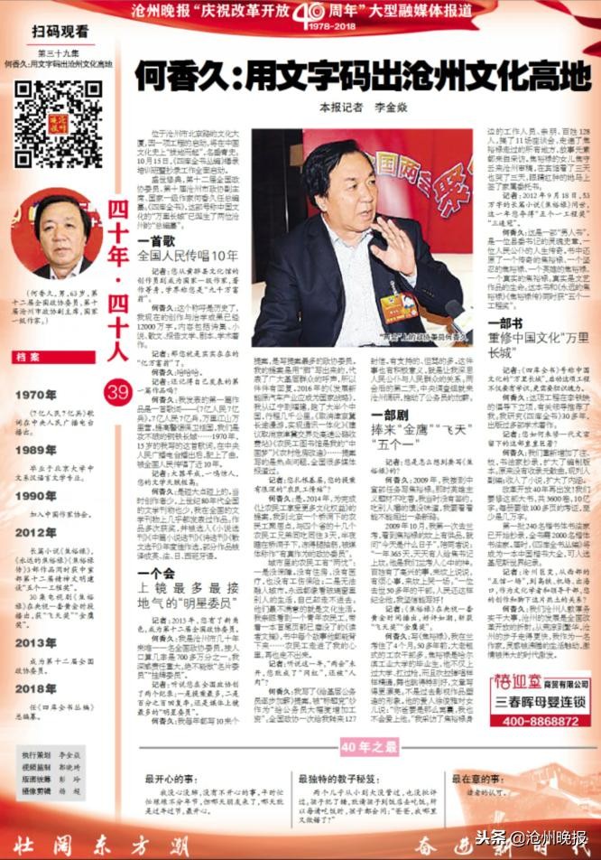 何香久:我们沧州人敦厚务实干大事,沧州的发展是全国改革开放的折射。从荒凉到繁华,沧州的步子走得更快,我作为一名作家,灵感被沸腾的生活触动,激情被伟大的时代激发。