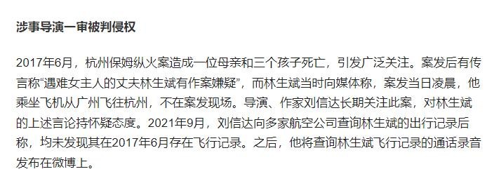 就在4月15日,杭州“保姆纵火案”再次被翻了出来,是导演刘信达和林生斌之间的摩擦。