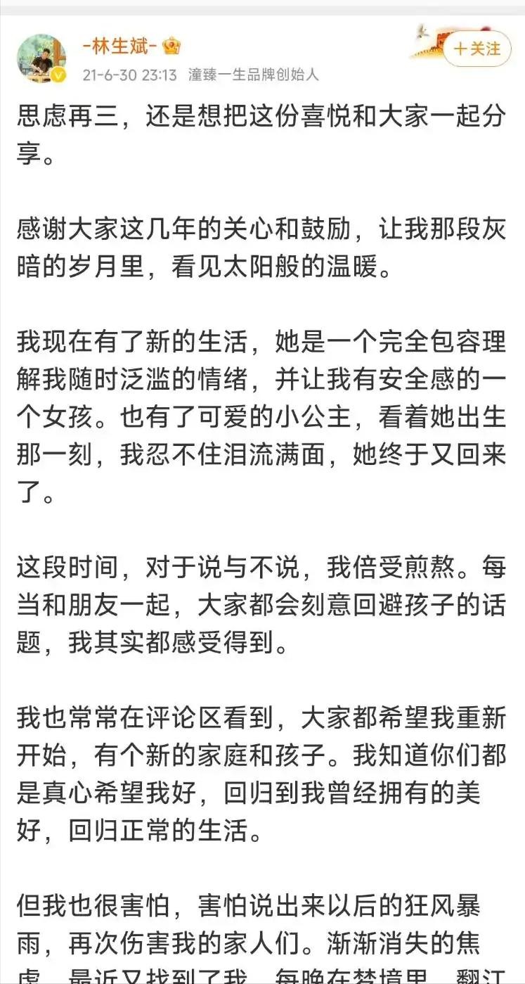 当时就有网友怀疑,林生斌的状态并不像失去妻儿的样子,事情的转机出现在2021年,那个时候林生斌突然在社交平台上宣布他已经再婚生女了。