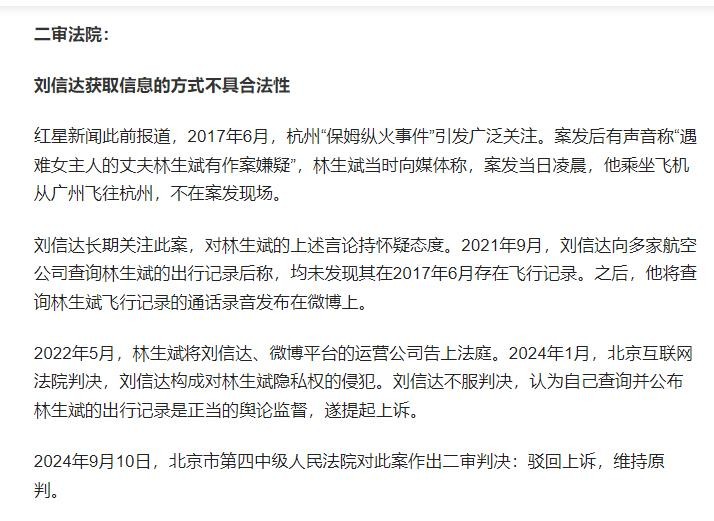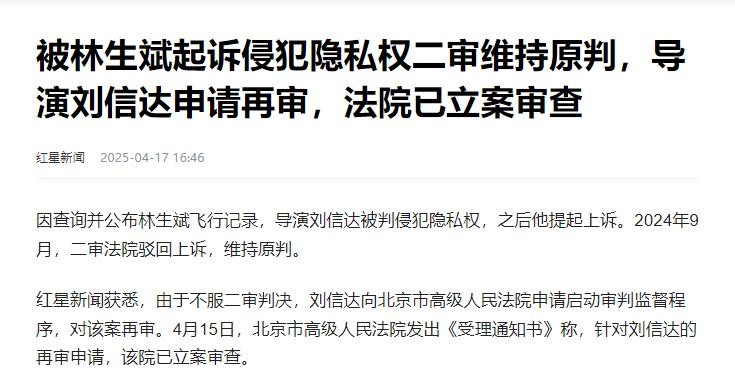 信息来源:红星新闻2025-04-17被林生斌起诉侵犯隐私权二审维持原判,导演刘信达申请再审,法院已立案审查