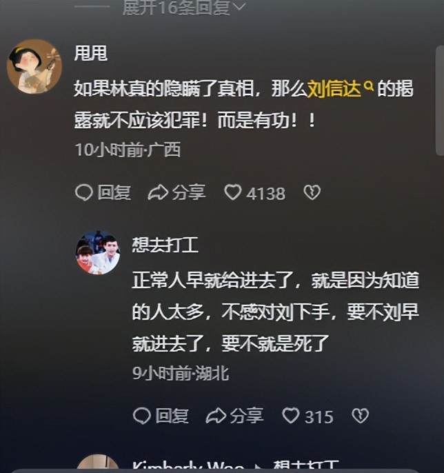 有网友评论“如果林生斌真的隐瞒了真相,那么刘信达的揭露就不应该犯罪,而是有功”,那个时候刘信达一直在关注此事,觉得漏洞百出,所以才展开了调查。