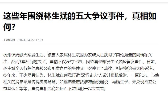 信息来源:上游新闻2024-04-27这些年围绕林生斌的五大争议事件,真相如何?