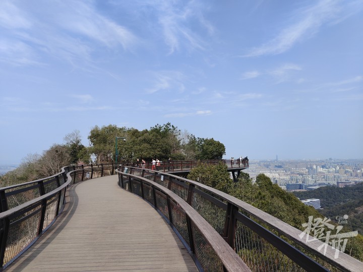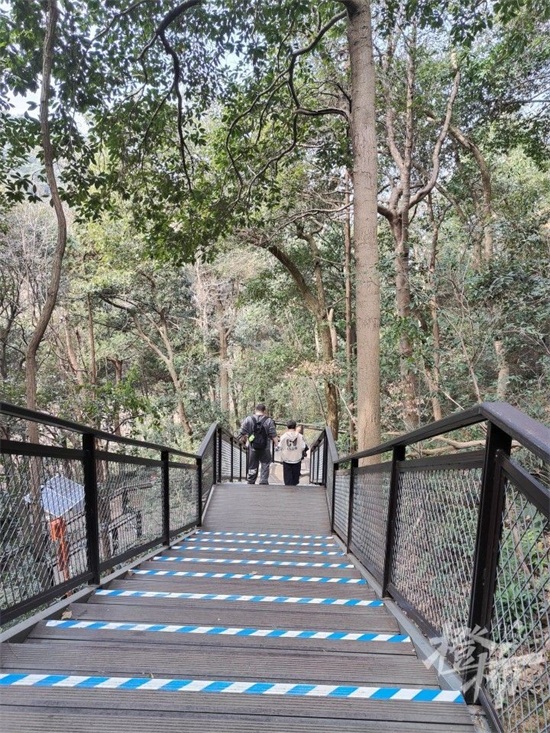 春节假期结束第一天,仍旧有不少市民和游客前来打卡,有老有少,其中不少人还带着登山杖等徒步装备。沿着小路上山,沿山路一直走,就可以看到上山的木质栈道,台阶上贴着蓝白相间的反光条。