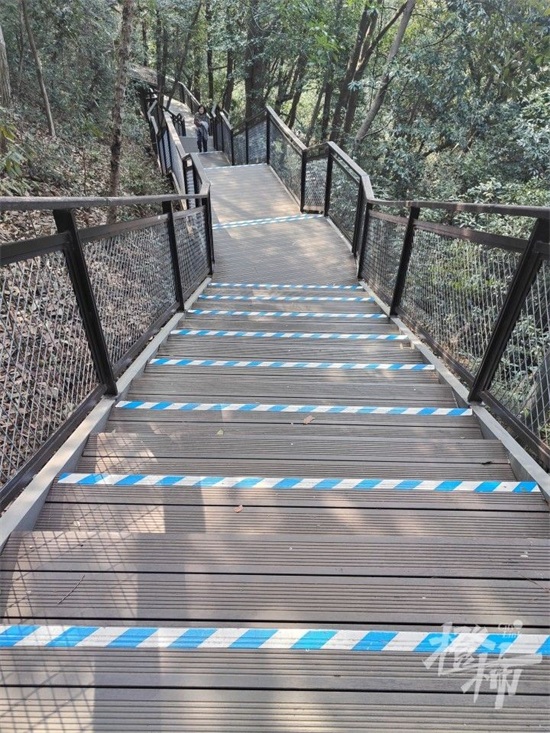 大年初七,杭州00后姑娘小蔡带着远道而来的亲戚打卡了杭州著名的网红绿道——马家坞观景平台。沿途风景很美,登顶之后可以俯瞰大半个杭州城,但下山时却遇到了一件糟心事:木质台阶上贴着的反光条,让小蔡差点崴了脚。