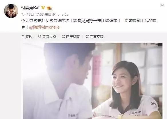 7月19日,陈晓陈妍希北京举办婚礼,下午,柯震东在微博上晒出与陈妍希在《那些年我们一起追的女孩》的剧照送上祝福,“今天男孩要赴女孩最后的约!等会儿见你一定比想象美!新婚快乐!我的青春!@陈妍希”。